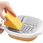 The 3-in-1 Cheese Grater with Storage Container is designed for versatile kitchen use. It comes with three blades and a non-stick coating, making it easy to grate, slice, and peel cheese, fruits, and vegetables. Its practical design helps save time and keeps food preparation neat and efficient.